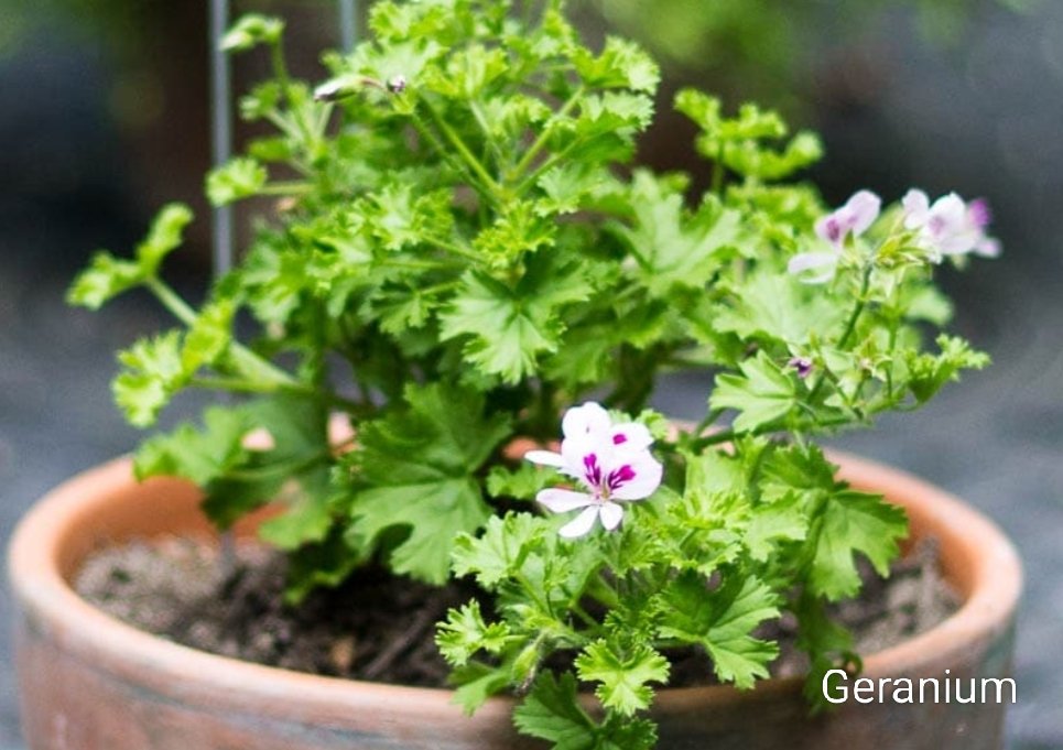 Scented geraniums, especially lemon-scented ones, are lovely to look at and great for repelling bugs. Their smell is similar to citronella.