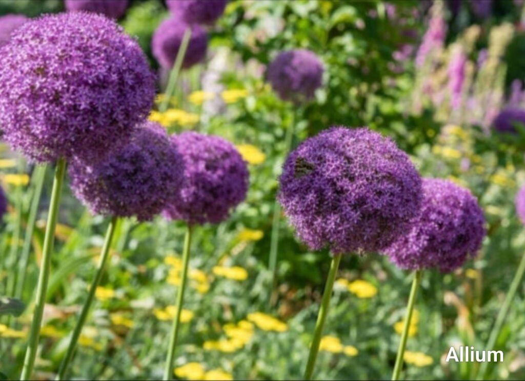 Allium flowers are globe-shaped and purple. They look great in any garden.